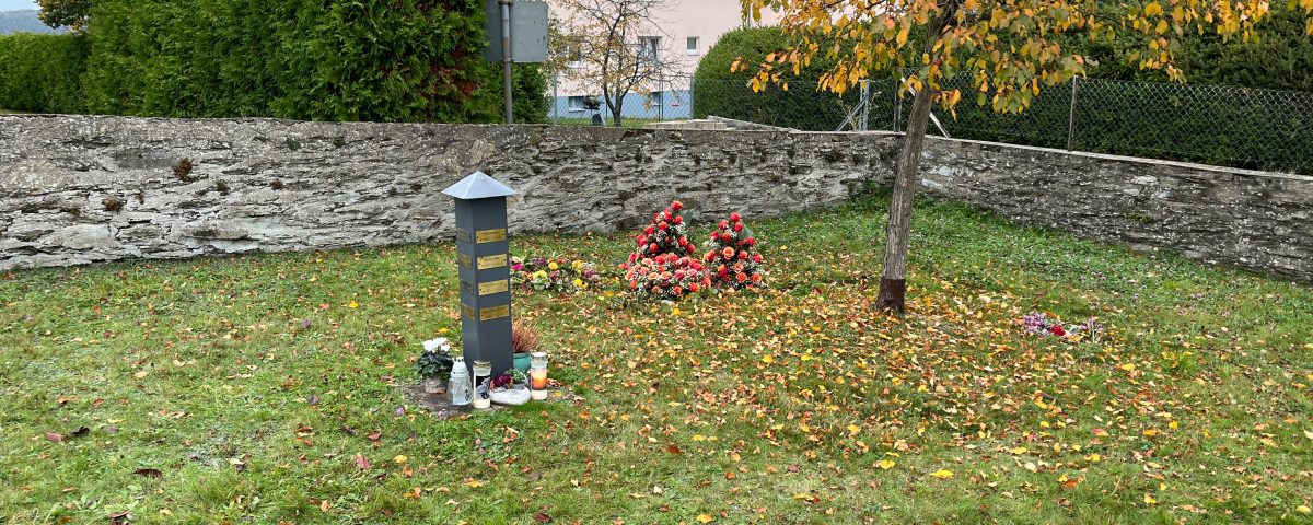 - An oder in der Nähe der Grabstätte kann eine Plakette mit den Daten des Verstorbenen angebacht werden.